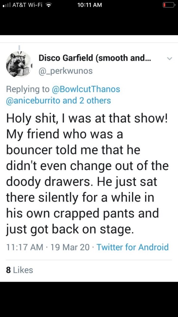I don’t know if it’s all the band or just whatever member runs their social media, but most posts are filled with the pro-Trump rhetoric which makes me roll my eyes. And, boy howdy, do they love when people attack them on Twitter and they get to cuck out the libs… or whatever.