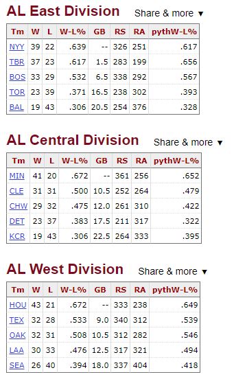 You’ll notice over the last three days that I support a lot of chalk. I still believe that the cream rises to the top, so the Dodgers, Yankees, and Astros had to be here. But this year we’re essentially trying to predict if the playoffs started in June rather than October. Here’s what the divisions looked like on 6/6/19, when every team had played at least 60 games.