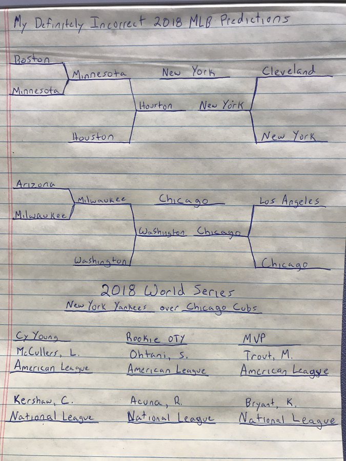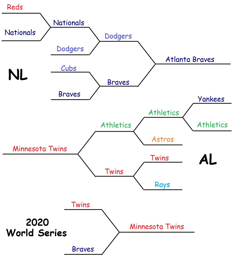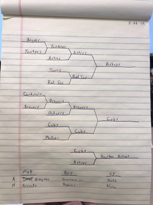 Every year, around late-March, I write up my postseason predictions for MLB on a legal pad and tape it to my cubicle wall. I did it this year, too. Then, well, you know. For like 8 years, I guessed that the Nationals would win it all, because frankly it made sense. Then I stopped doing that and believed too much in a Cubs resurgence. Then the Nationals won the Series. So lets just put as much value as possible into what I’m about to predict. If I’m right, I will spend the rest of my life angry that I didn’t put money on this result.