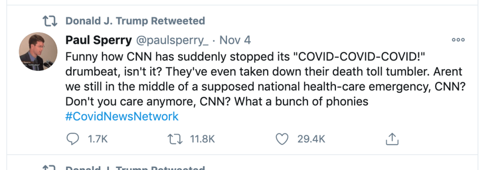 Remember how I said there were people saying COVID would, somehow, magically vanish after the election? The implication there was obvious: the media was over-blowing statistics in order to hurt President Trump’s re-election chances. Even my wife, a sane and wonderful woman who is truly my better in every sense, has said that the benefit of having such a stressful election is that CNN has, temporarily, removed the chyron of the amount of Americans we’ve lost to COVID.