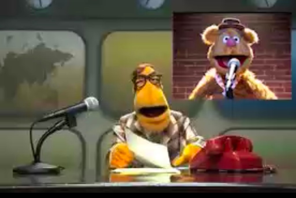 Our movie opens on Ryan Gosling as “Ryan Gosling” walking down a city street. It’s sunny out, cheerful even, upbeat music plays over the scene as he passes by a shop that has a bunch of TVs in the front window. The camera lingers behind just long enough to see Fozzie hosting a Fallon-esque late night show. That clip then pulls back to an over the shoulder graphic and reveals The Newsman continuing the broadcast (because it’s daytime, so obviously a late night show wouldn’t be live, that wouldn’t make any sense and one must think about such things when making a movie).