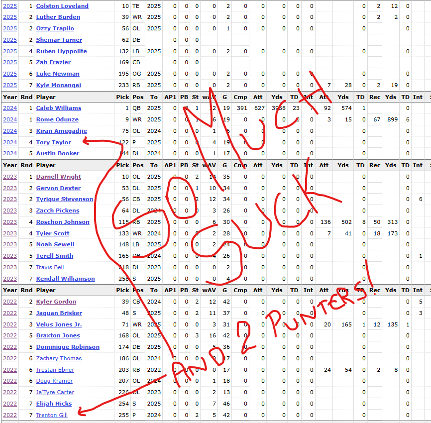 I’m not even wasting my time on the 2025 draft because it’s the one that makes me the most viscerally angry. Why draft help on the offensive line or defensive line, where there was so much need, or in the secondary, where the team was razor thin, when they could draft a tight end they don’t throw to, and in doing so, passing up a more highly rated tight end who has already been excelling in the NFL. Seriously, Colston Loveland over Tyler Warren has a chance to look incredibly stupid. Then they drafted Luther Burden in the second round to fill the vaunted role of backup kick and punt returner. Then they got around to drafting an offensive lineman and a defensive lineman. Neither of them play, but they exist.